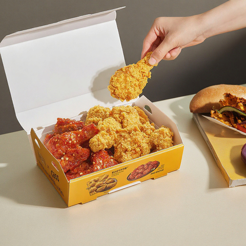 Cajas de embalaje de alitas de pollo y patatas fritas coreanas personalizadas, bandeja para salsa, caja de cartón de papel plegable para llevar al por mayor para pollo frito